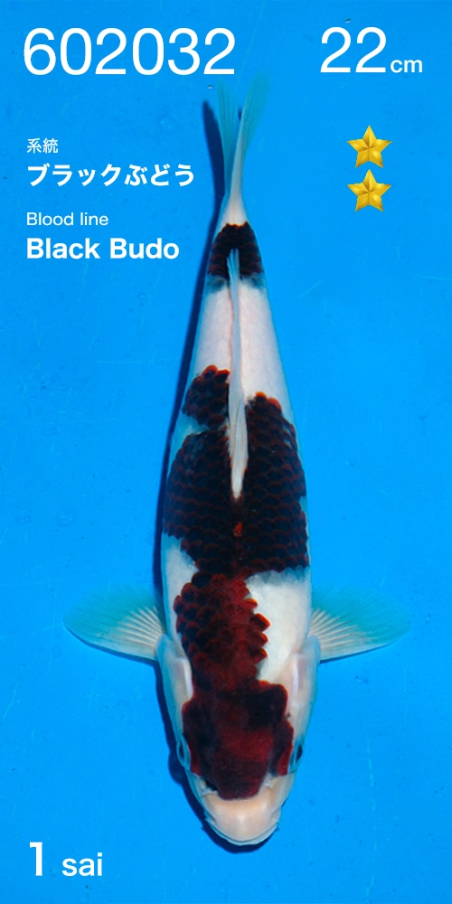 Un très, très beau Budo goromo par Ogata lignée black budo 2. Un koi issu de la fameuse lignée black budo, sans conteste la meilleure lignée pour cette variété.