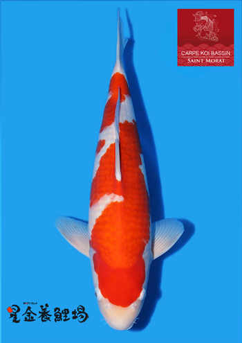 Un Hoshikin nisai kohaku 01 mâle de 50 cm. Un koi avec un hi très vif.