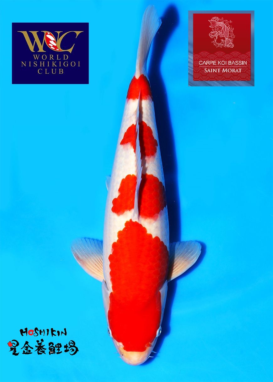 Un très flamboyant Hoshikin nisai kohaku mâle WCB 3 d’environ 40 cm . Pattern superbe, parfaitement découpé avec un hi très profond.