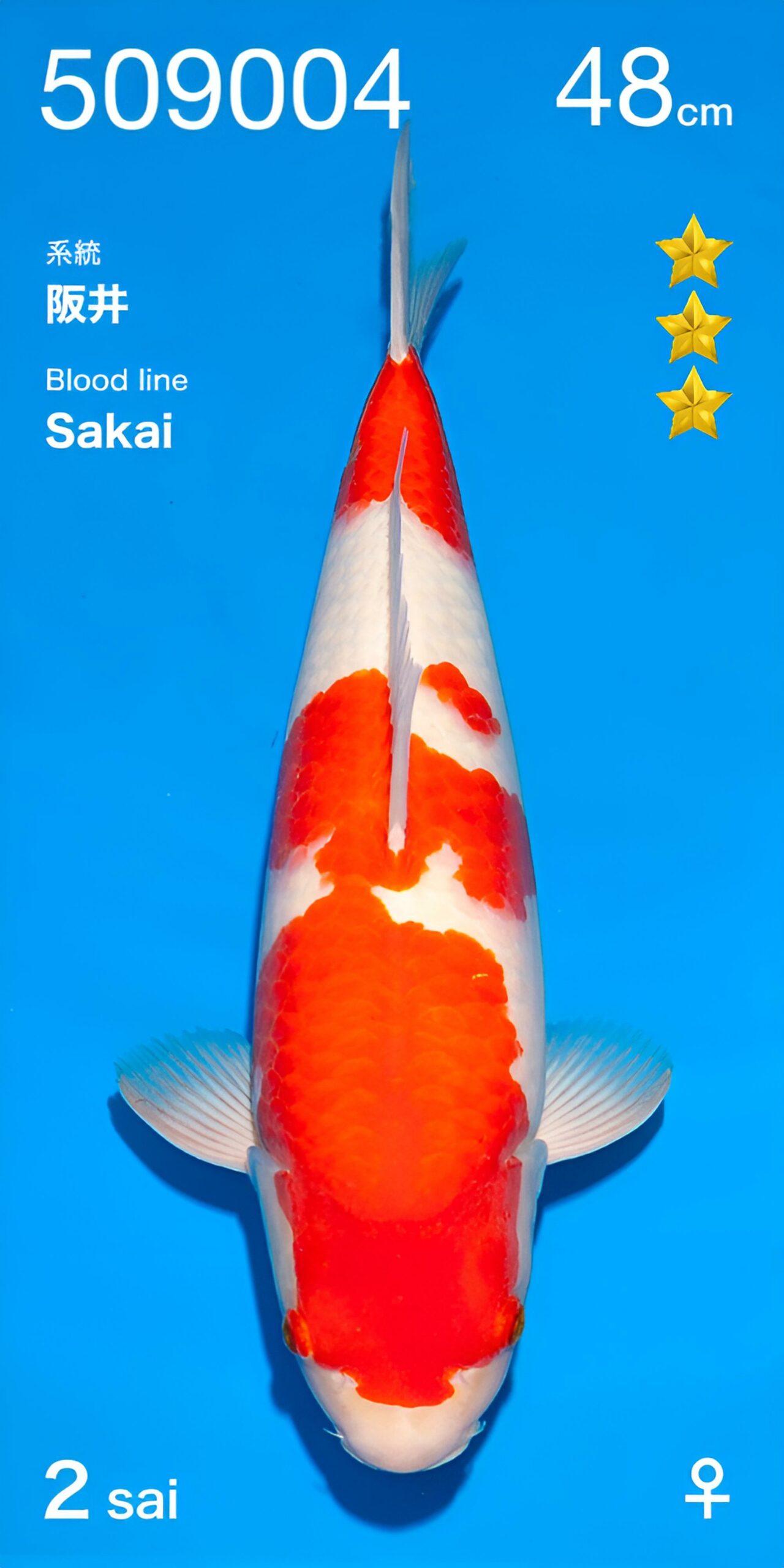 Un Kohaku Sakai nisai femelle d’Ogata de 48 cm. Un koi avec un très beau body sur un shiroji très propre.
