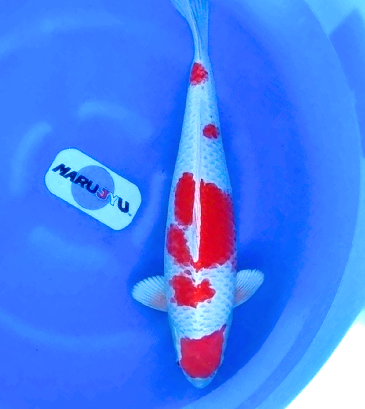 Un inaccoutumé Maruten-Sakura-ogon-Marujyu-nisai- de 55 cm, femelle. Un koi avec un shiroji crémeux typique de cette variété.