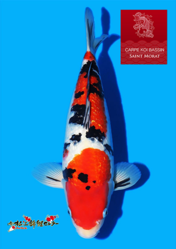 Un très vif Matsue nisai ginrin sanke mâle 40 cm. Un koi avec un vrai beau ginrin sur un beni vif et un sumi épais.