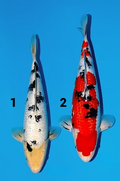 Un choix cornélien entre ces deux koi Momotaro ginrin sanke ginrin beko de 34 et 39 cm (beko 34/35, sanke 38/39). très bons body et superbe ginrin pour ces deux tosai.