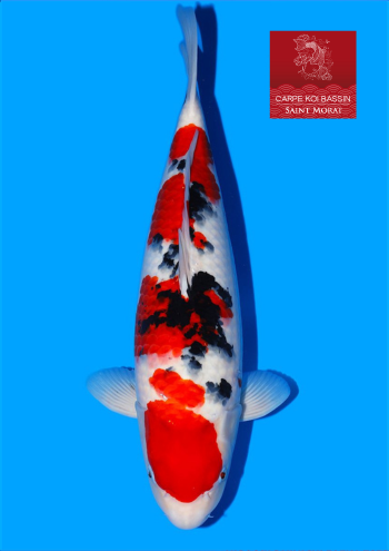 Un Sanke nisai Femelle Tamaura de 53 cm. Un sanke avec tout ce qui convient à cette variété. un pattern de kohaku, un hi bien vif sur un shiroji très lumineux et un sumi qui vient ponctué l’ensemble.