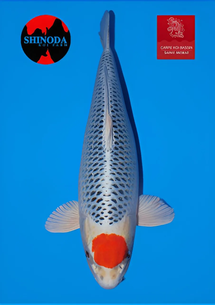 Un très beau Tancho kujaku sansai femelle Shinoda de 60 cm. Une réticulation impeccable avec un maru épais.