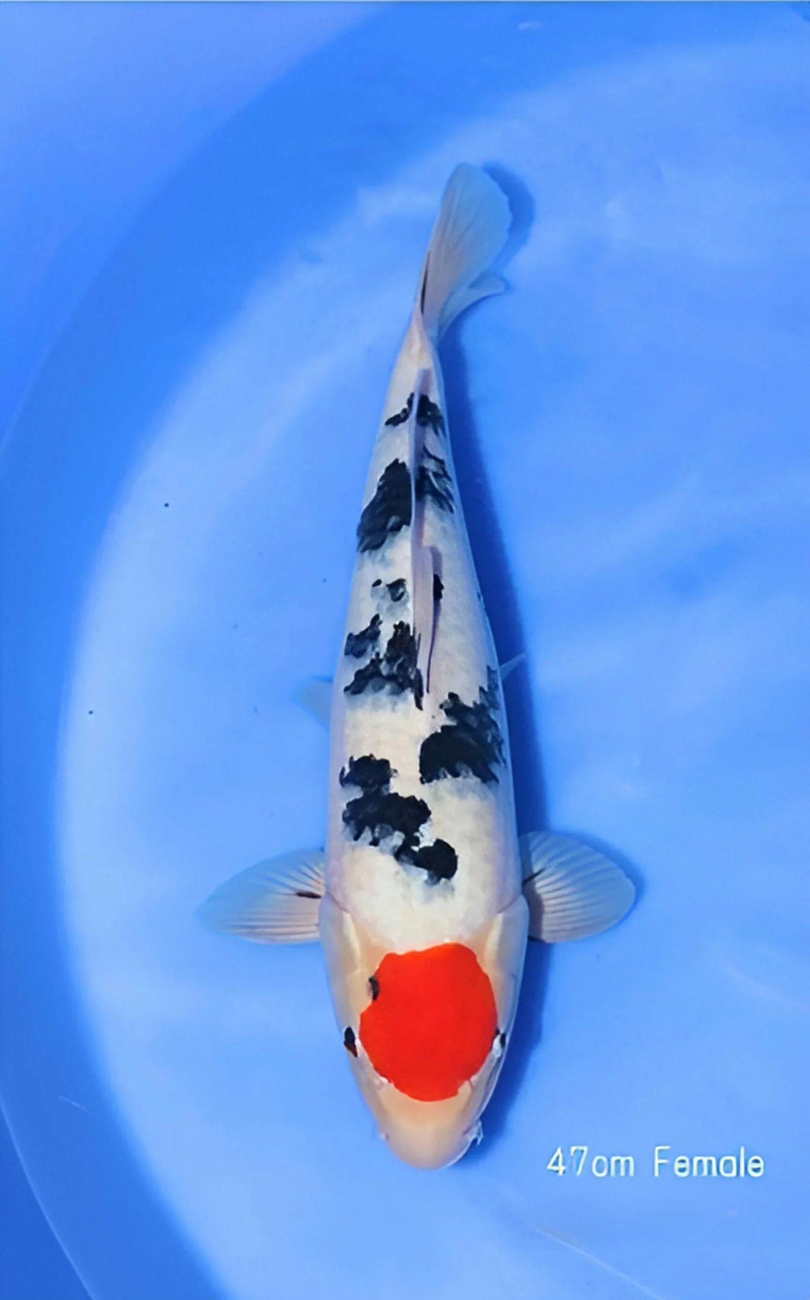 Un très bon tancho-sanke-marudo nisai femelle 2 de 47 cm. Beau body, bon maru, sumi en développement.